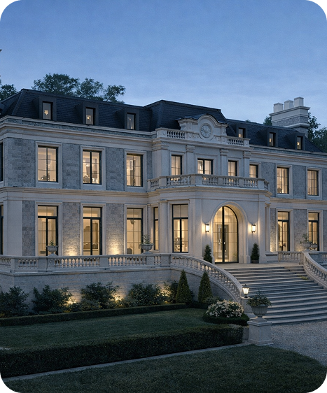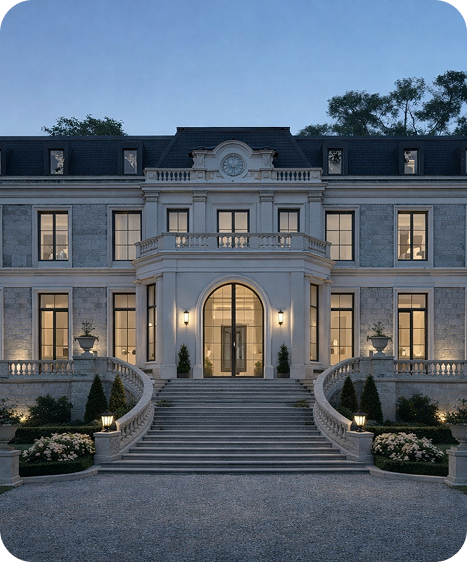 A grand, classically composed estate defined by symmetrical massing, mansard rooflines, carved stone façades, and formal axial planning.